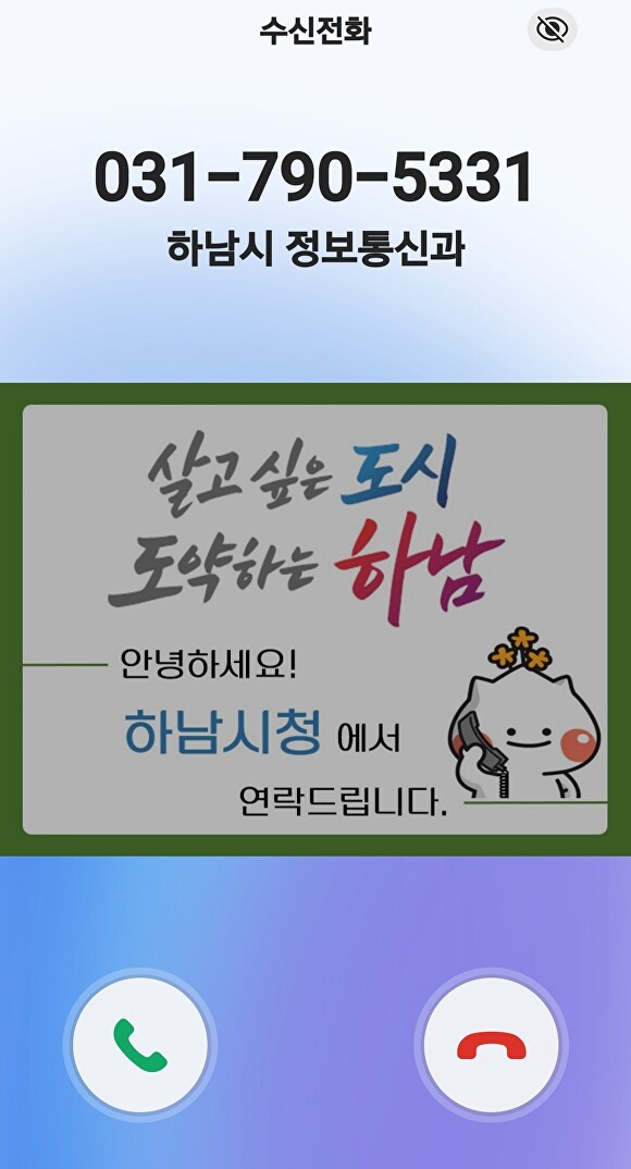 이에 시는 민원업무가 많은 부서를 중심으로 총 200회선에 해당 서비스를 우선 적용했다. 앞으로 시청에서 전화를 받을 경우 시민의 휴대전화 화면에는 ‘하남시청 ○○과’ 등 발신 부서명이 함께 표시돼 행정기관임을 즉시 확인할 수 있다.
