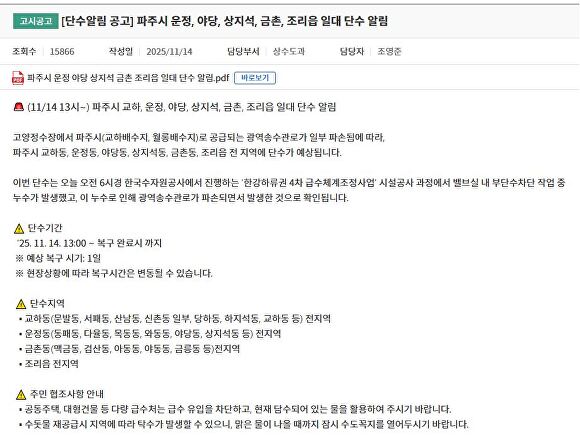 단수 지역은 운정, 야당동, 상지석동, 금촌동, 조리읍, 교하동 일대다.