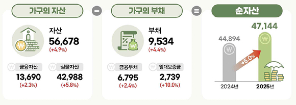 [아이뉴스24 신수정 기자] 2025년 3월 말 기준 우리나라 가구의 평균 순자산은 4억 7144만원인 것으로 조사됐다. 자산 증가 속도가 부채를 앞지르면서 순자산이 전년보다 5.0% 늘었다.