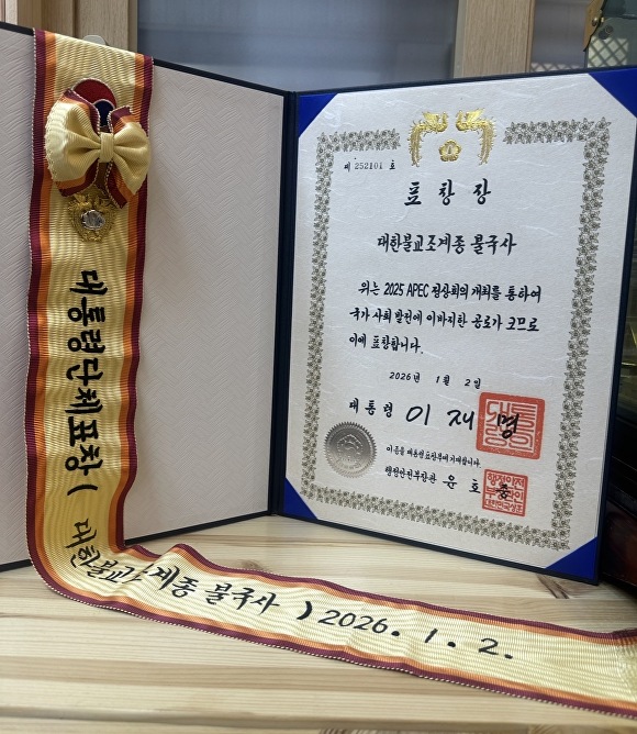 [아이뉴스24 이진우 기자] 대한불교조계종 불국사가 2025 아시아태평양경제협력체(APEC) 정상회의 성공 개최에 기여한 공로를 인정받아 대통령 표창을 수상했다.
