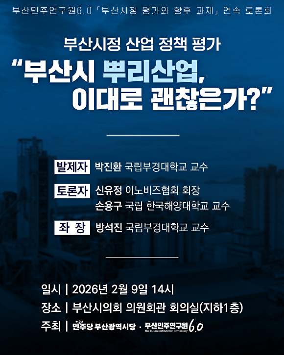 오는 9일 오후 2시 부산시의회 의원회관 회의실에서 열릴 첫 토론회는 '부산시 뿌리산업 이대로 괜찮은가'를 주제로 부산시의 전통 산업정책을 평가하고 발전방안을 모색한다.