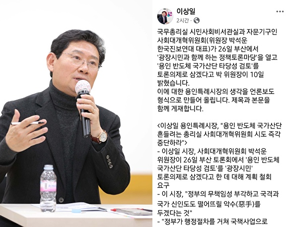 [아이뉴스24 정재수 기자] 이상일 용인특례시장이 국무총리실 자문기구인 사회대개혁위원회가 ‘용인 반도체 국가산단 타당성 검토’를 정책토론 의제로 올리겠다고 밝힌 데 대해 “정부의 무책임성을 부각시키고 국격과 국가 신인도를 떨어뜨릴 악수(惡手)”라며 즉각 철회를 촉구했다.
