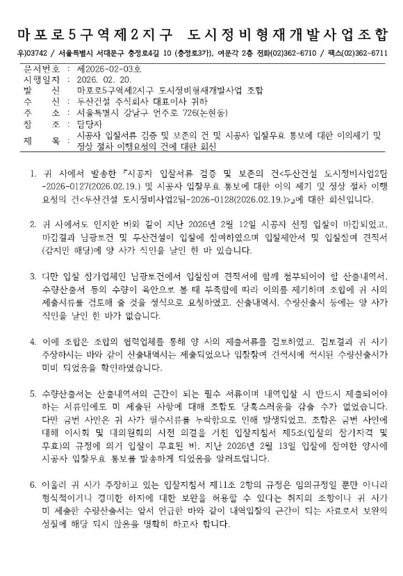 이에 두산건설은 2월 19일 입찰 무효 통보에 대해 이의를 제기하고, 입찰서류 검증 및 정상 절차 이행을 요청했지만, 조합은 두산건설이 누락한 수량제출서는 경미한 하자에 해당되지 않는다며 유찰을 재확인한 것이다.