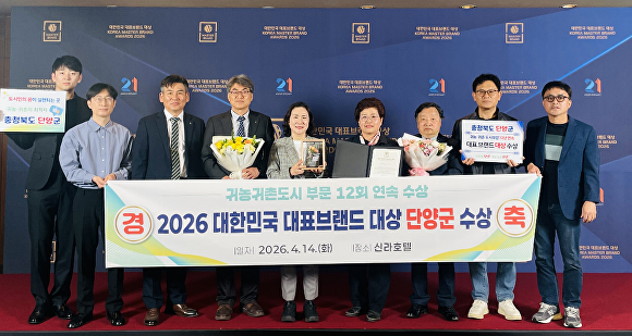15일 단양군에 따르면 전날 서울 신라호텔에서 열린 ‘2026 대한민국 대표브랜드 대상’ 시상식에서 12년 연속 귀농귀촌도시 부문 대상을 차지했다.
