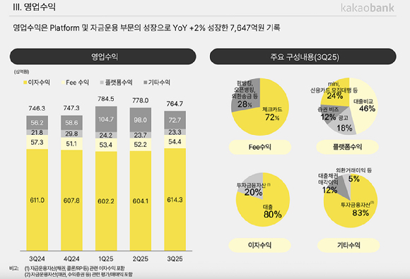 3분기 누적 비이자수익은 8352억원으로 전년 동기 대비 26.7% 늘었다. 카뱅은 "고객 트래픽, 수신 성장을 바탕으로 수수료·플랫폼 사업과 자금 운용 등 포트폴리오 다변화에 역량을 집중한 결과다"고 설명했다.