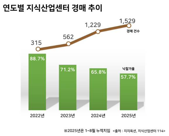 올해 들어 잔금 마련 등이 어려워 법원 경매로 넘어가는 지식산업센터도 늘고 있다. 지식산업센터114에 따르면 올해 들어 8월까지 경매에 나온 수도권 지식산업센터는 총 1529건이다. 지난해 전체(1229건)보다 24% 늘었다. 2022년에는 315건, 2023년에는 562건 수준이었다.